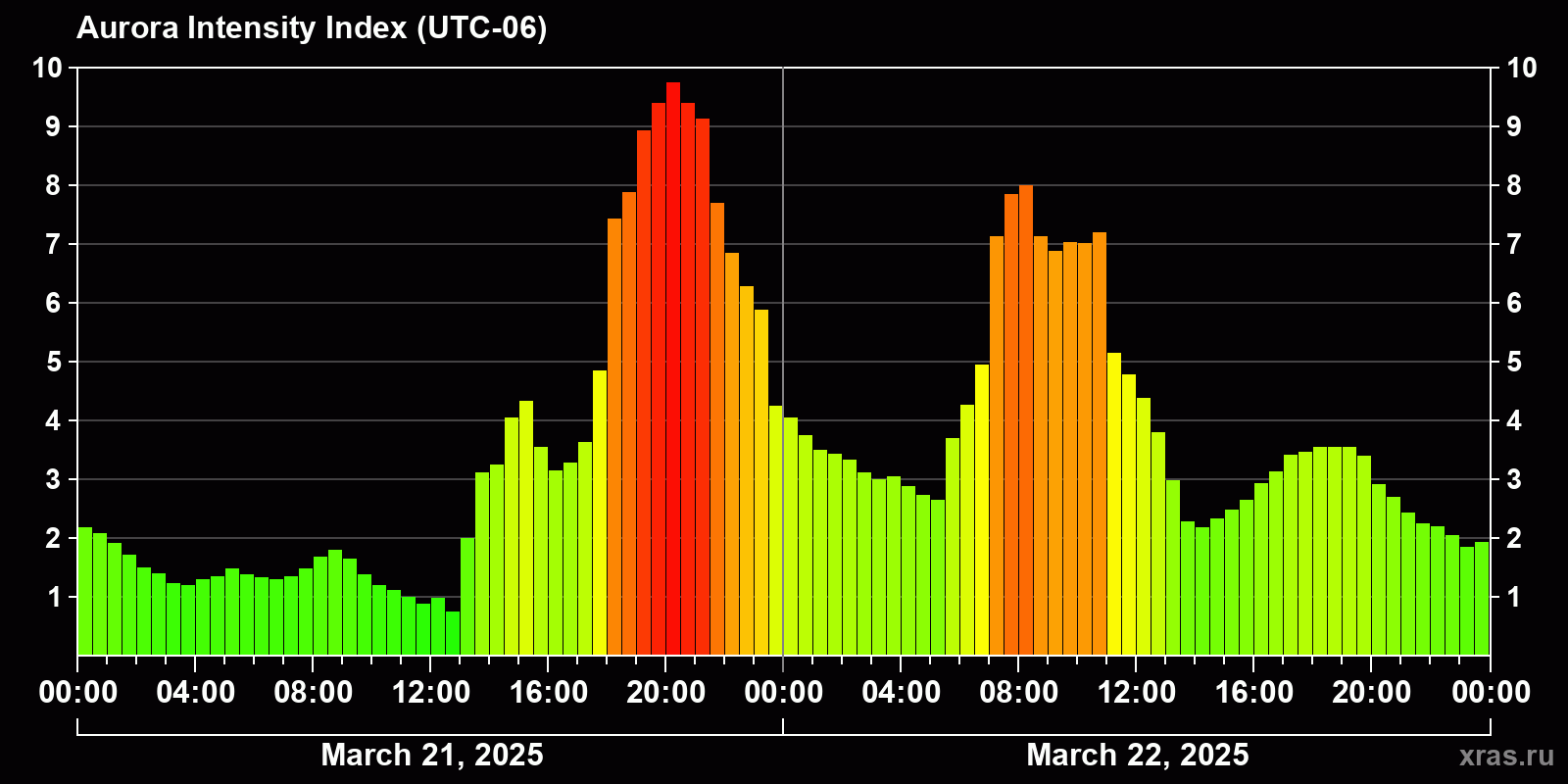 Changes in the auroral intensity index from 2025-03-21 to 2025-03-22 local time