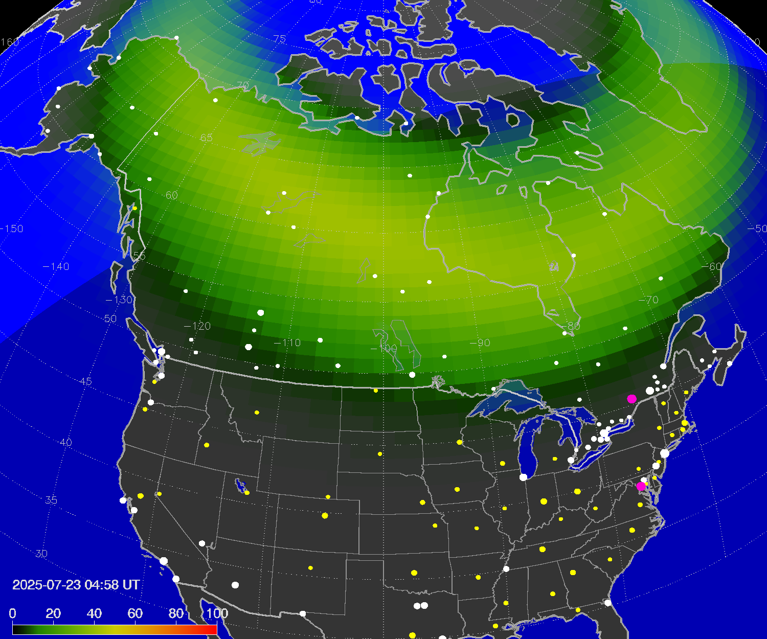 Probability of northern lights (auroras) in cities of Canada