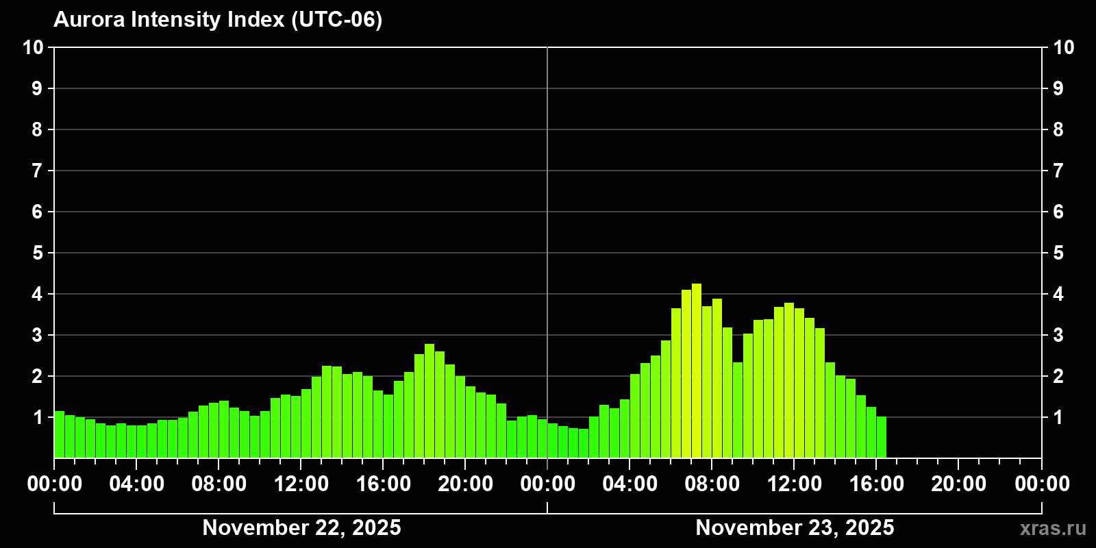 Auroral intensity index and the theoretically possible latitude of observations for nighttime in the Western Hemisphere as of 2025-11-23 15:57 (end of day) local time