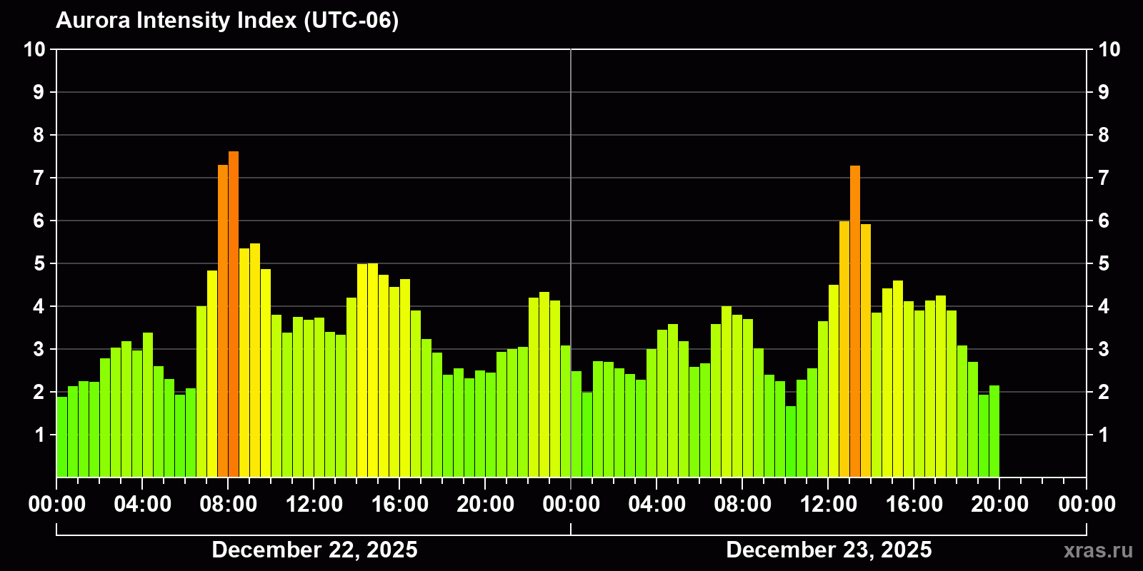 Auroral intensity index and the theoretically possible latitude of observations for nighttime in the Western Hemisphere as of 2025-12-23 16:05 (end of day) local time