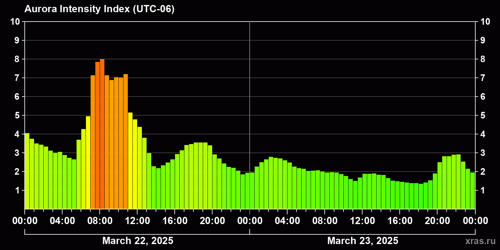 Changes in the auroral intensity index from 2025-03-22 to 2025-03-23 local time