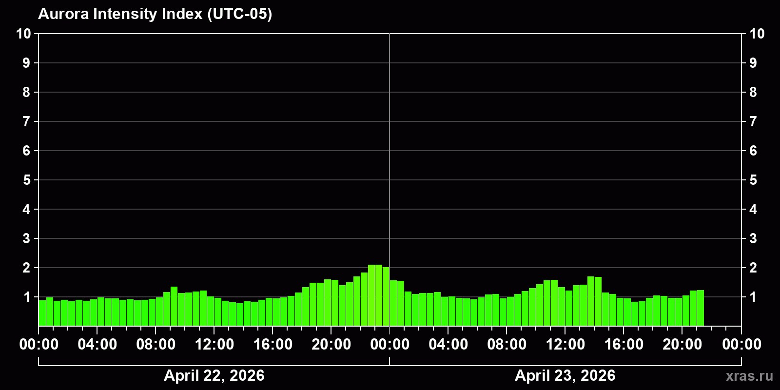 Auroral intensity index and the theoretically possible latitude of observations for nighttime in the Western Hemisphere as of 2026-04-23 19:42 (end of day) local time
