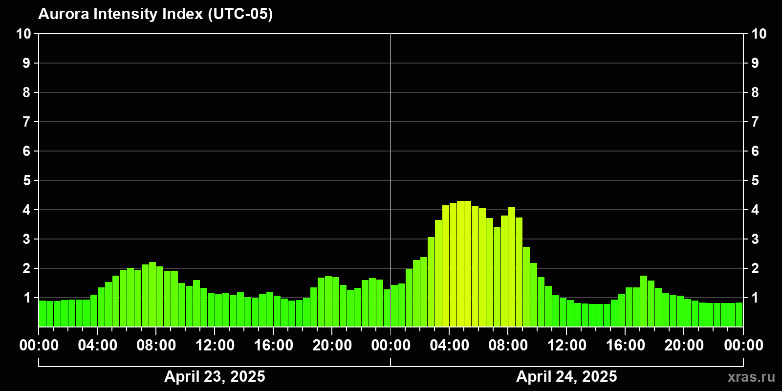Auroral intensity index and the theoretically possible latitude of observations for nighttime in the Western Hemisphere as of 2025-04-24 23:48 (end of day) local time