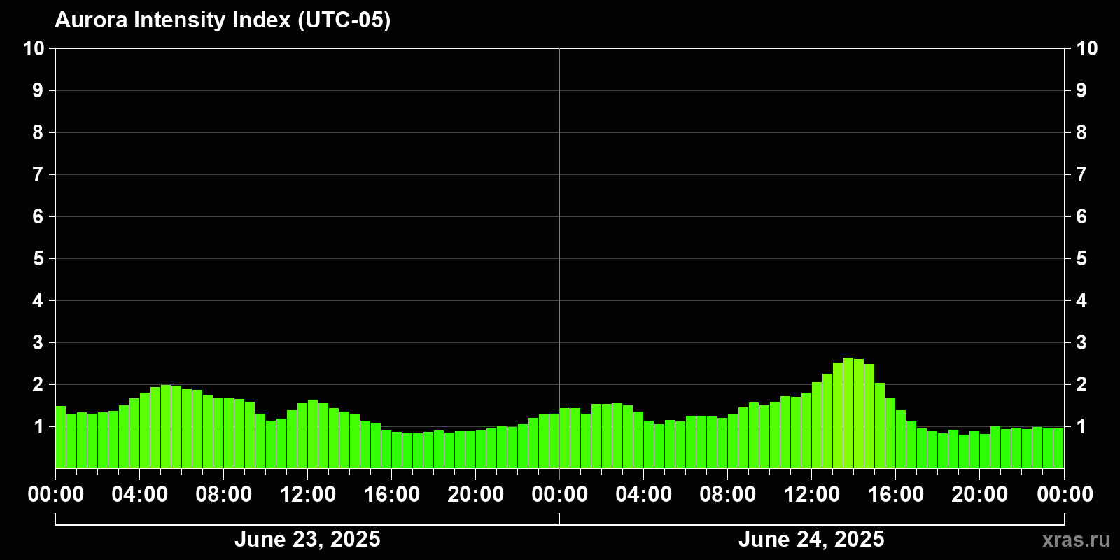 Auroral intensity index and the theoretically possible latitude of observations for nighttime in the Western Hemisphere as of 2025-06-24 23:55 (end of day) local time