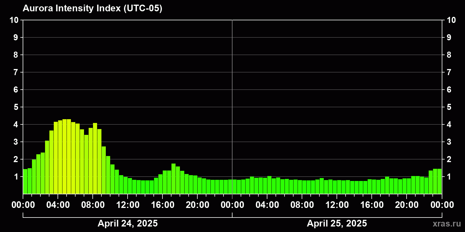 Auroral intensity index and the theoretically possible latitude of observations for nighttime in the Western Hemisphere as of 2025-04-25 23:44 (end of day) local time
