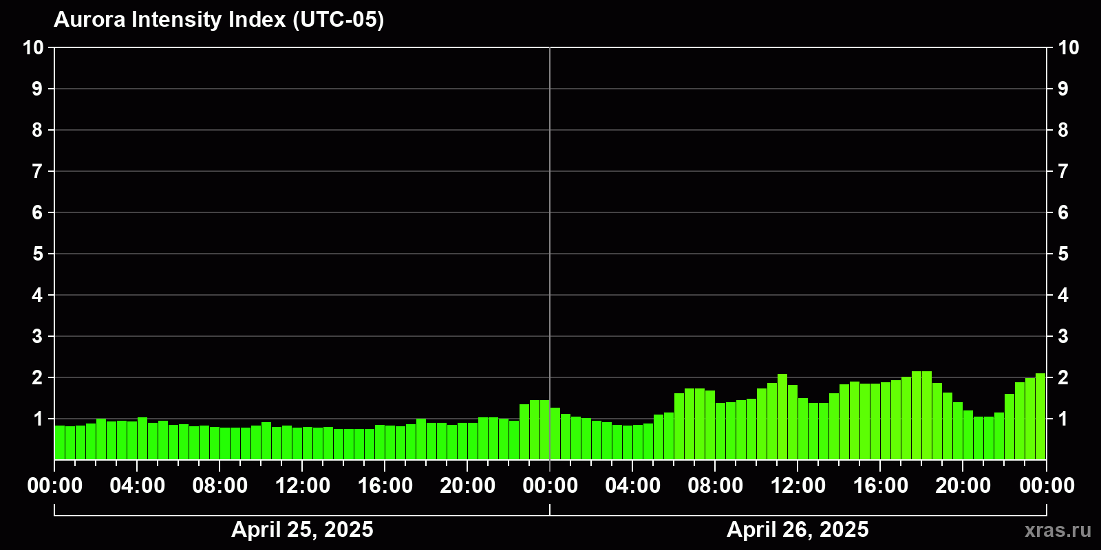 Auroral intensity index and the theoretically possible latitude of observations for nighttime in the Western Hemisphere as of 2025-04-26 23:55 (end of day) local time
