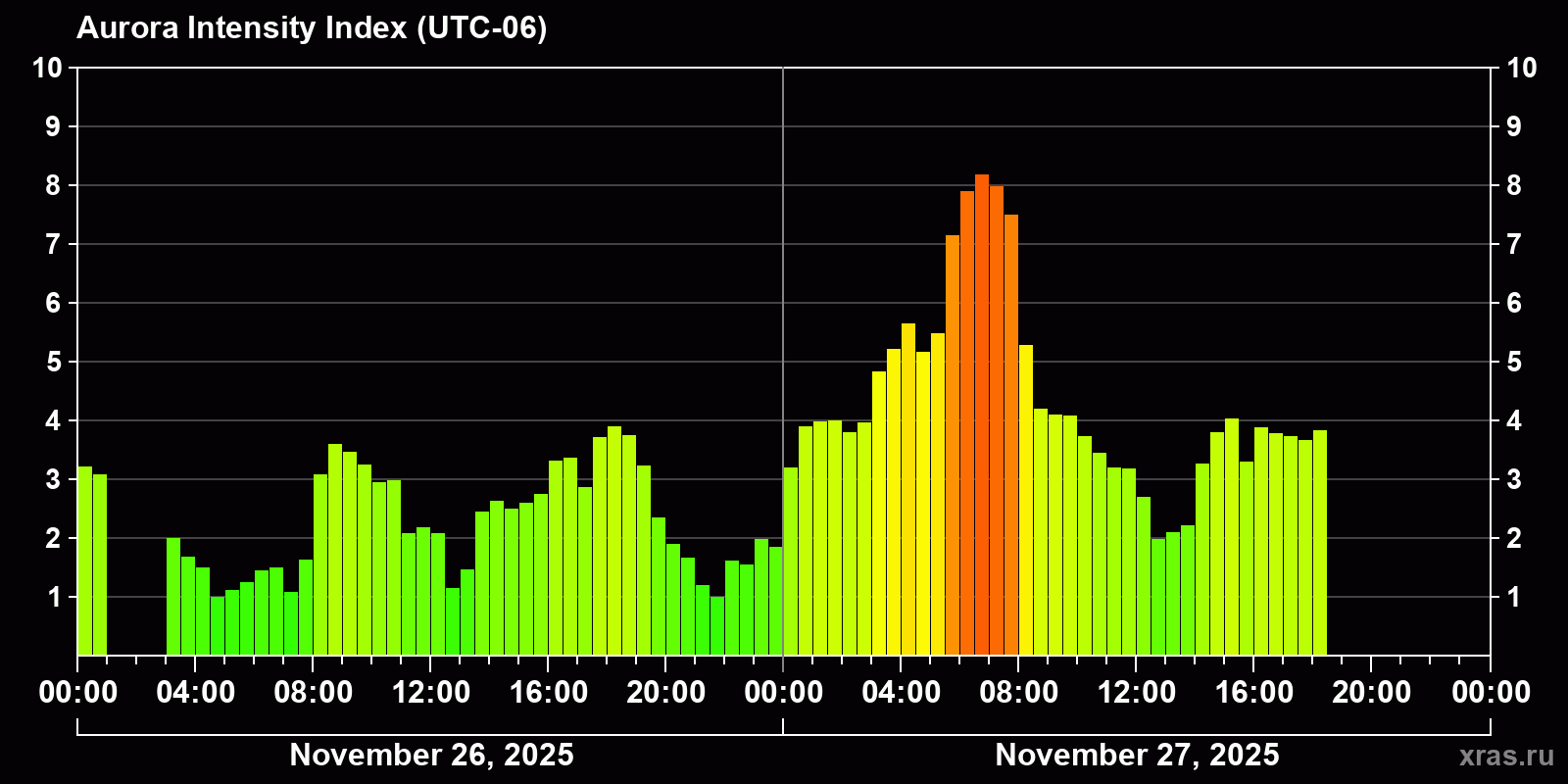 Auroral intensity index and the theoretically possible latitude of observations for nighttime in the Western Hemisphere as of 2025-11-27 17:18 (end of day) local time