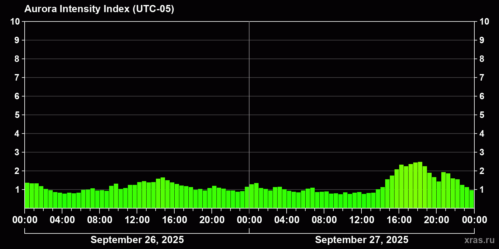 Changes in the auroral intensity index from 2025-09-26 to 2025-09-27 local time
