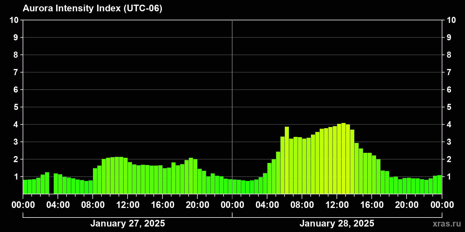 Auroral intensity index and the theoretically possible latitude of observations for nighttime in the Western Hemisphere as of 2025-01-28 23:45 (end of day) local time