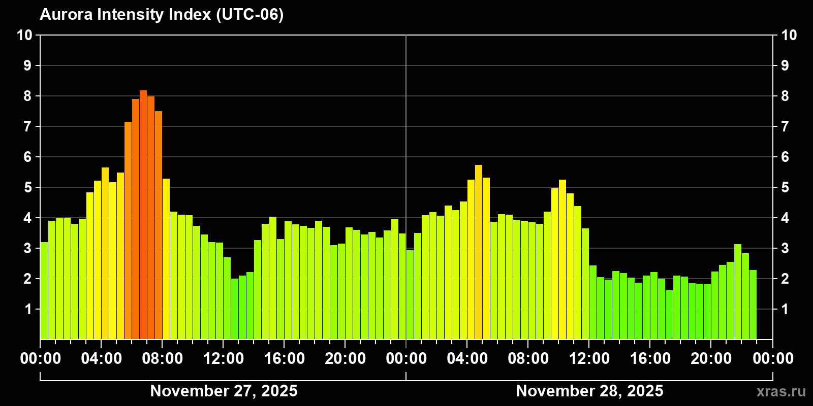 Auroral intensity index and the theoretically possible latitude of observations for nighttime in the Western Hemisphere as of 2025-11-28 21:06 (end of day) local time