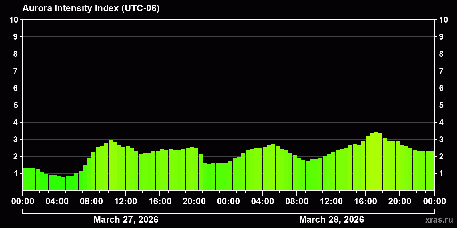 Changes in the auroral intensity index from 2026-03-27 to 2026-03-28 local time