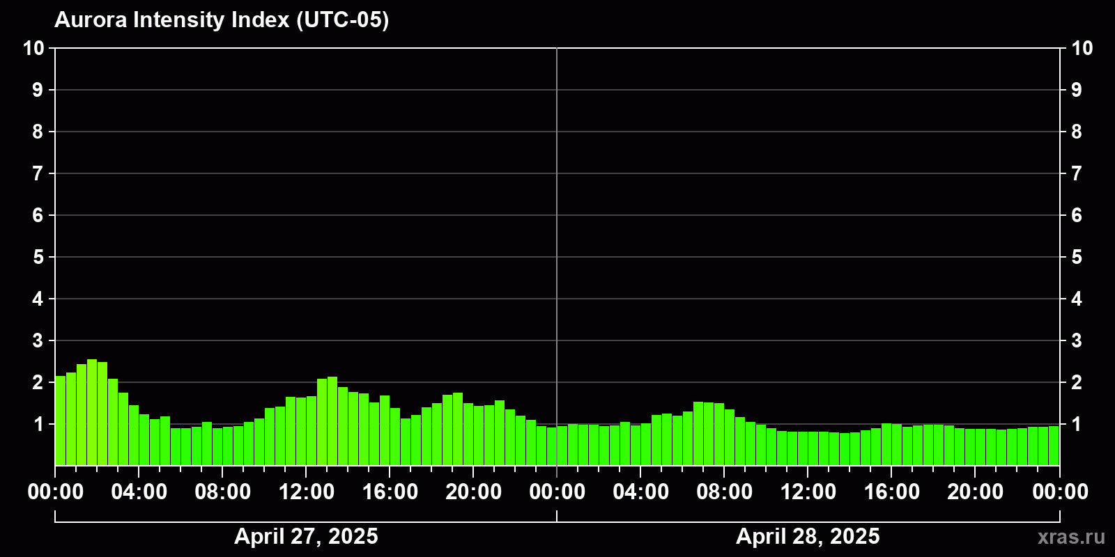 Auroral intensity index and the theoretically possible latitude of observations for nighttime in the Western Hemisphere as of 2025-04-28 23:58 (end of day) local time