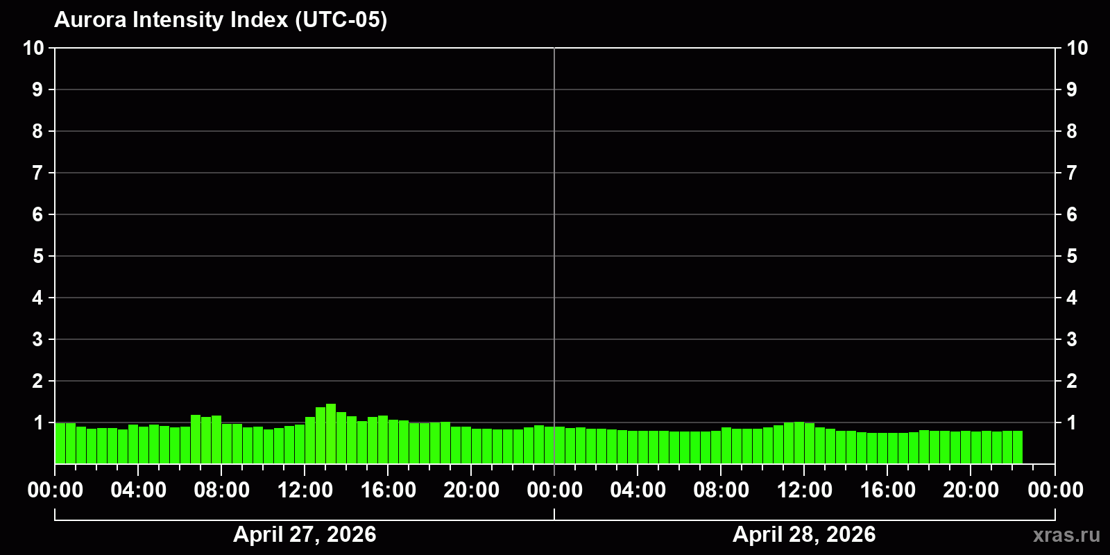 Changes in the auroral intensity index from 2026-04-27 to 2026-04-28 local time