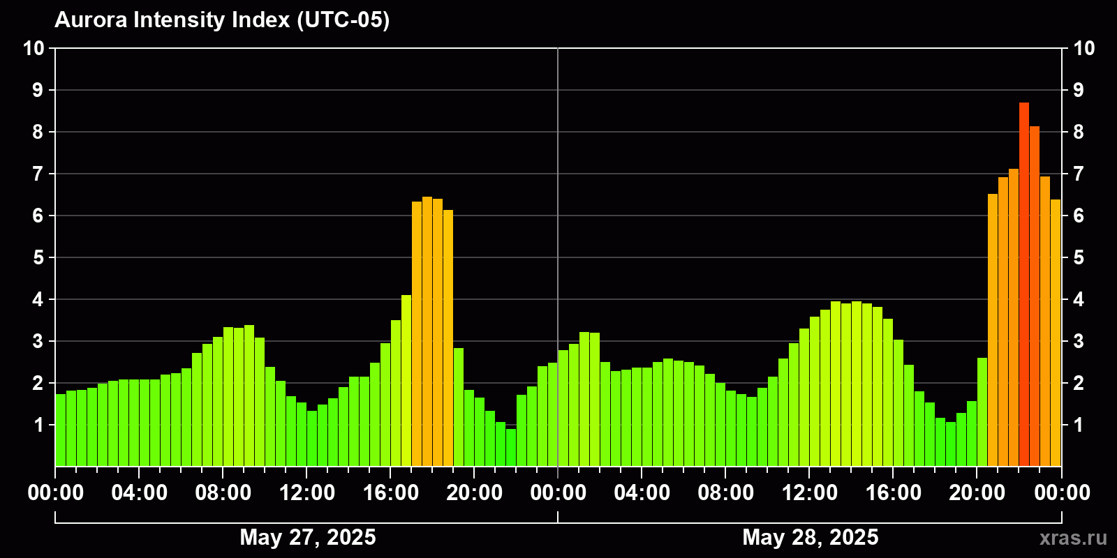 Auroral intensity index and the theoretically possible latitude of observations for nighttime in the Western Hemisphere as of 2025-05-28 23:54 (end of day) local time