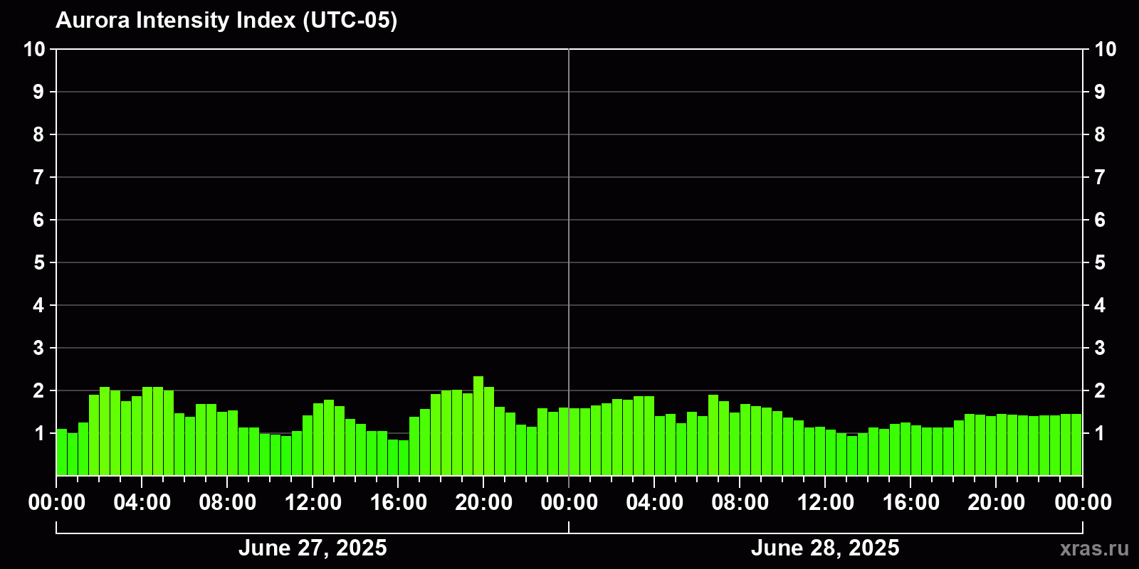 Auroral intensity index and the theoretically possible latitude of observations for nighttime in the Western Hemisphere as of 2025-06-28 23:53 (end of day) local time