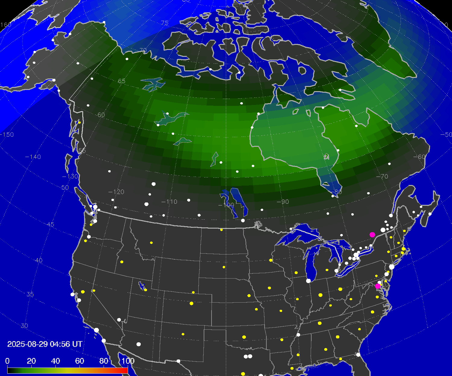 Probability of northern lights (auroras) in cities of Canada