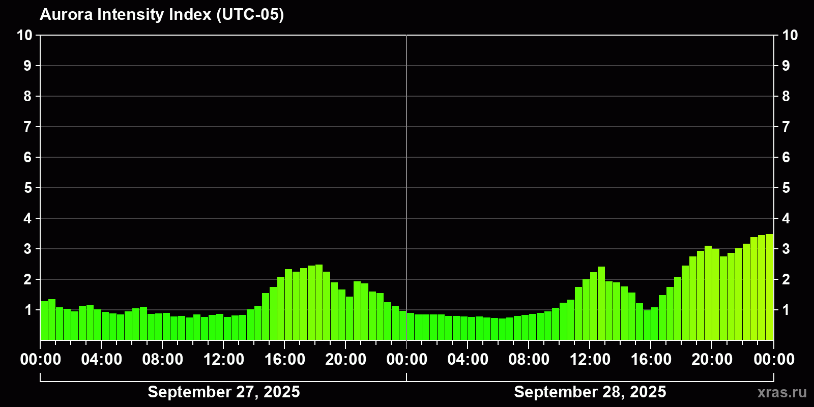 Auroral intensity index and the theoretically possible latitude of observations for nighttime in the Western Hemisphere as of 2025-09-28 23:57 (end of day) local time