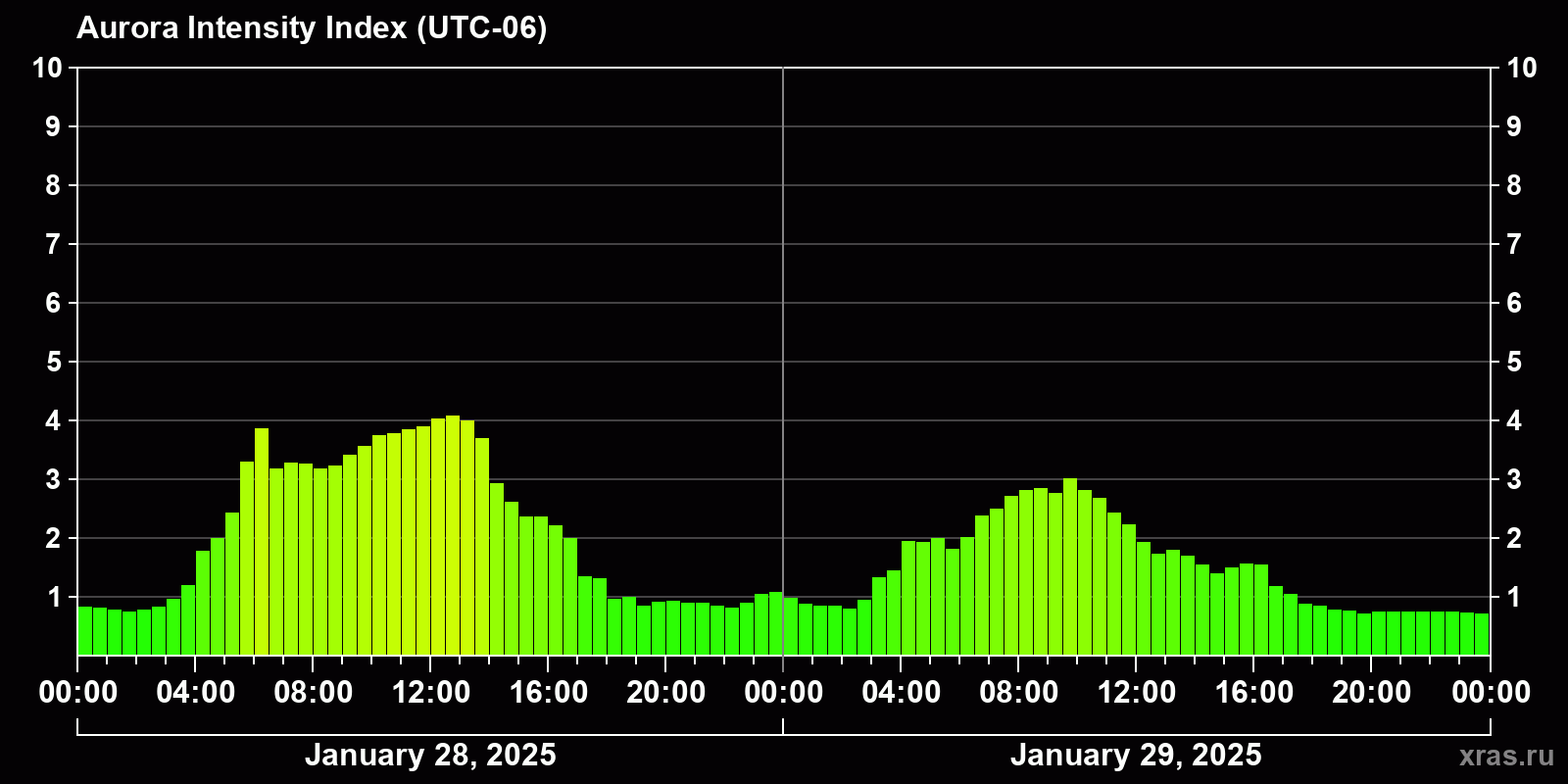 Changes in the auroral intensity index from 2025-01-28 to 2025-01-29 local time