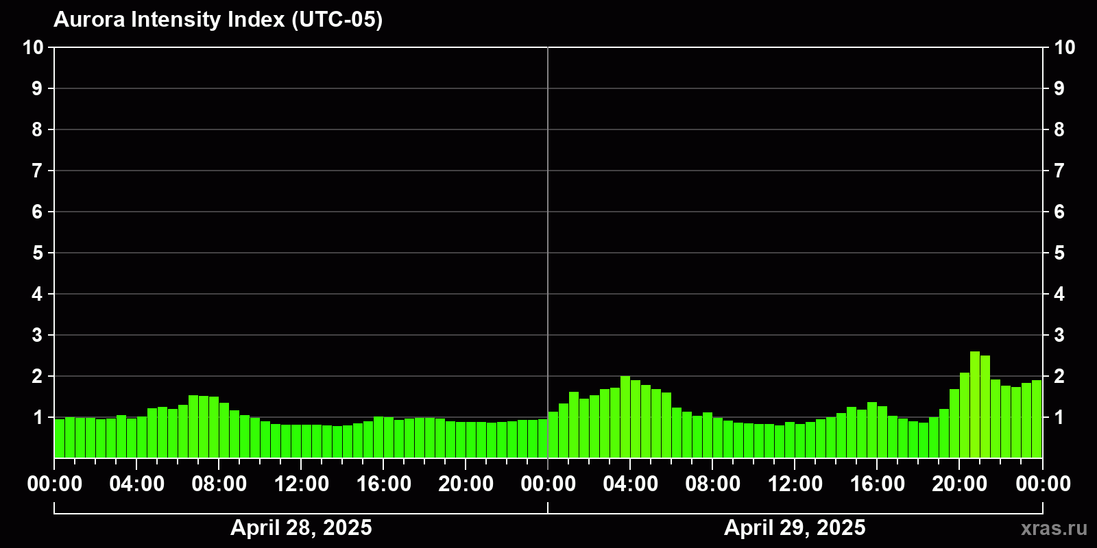 Changes in the auroral intensity index from 2025-04-28 to 2025-04-29 local time