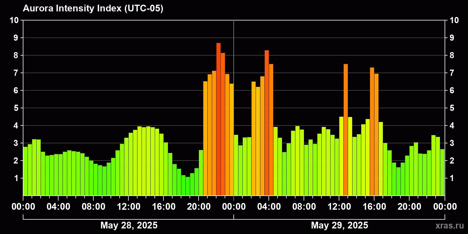 Changes in the auroral intensity index from 2025-05-28 to 2025-05-29 local time
