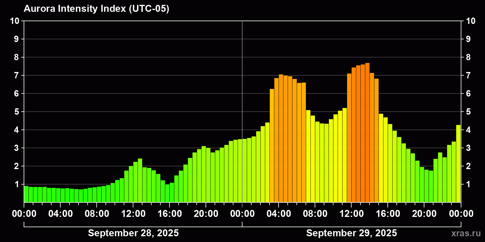 Auroral intensity index and the theoretically possible latitude of observations for nighttime in the Western Hemisphere as of 2025-09-29 23:50 (end of day) local time