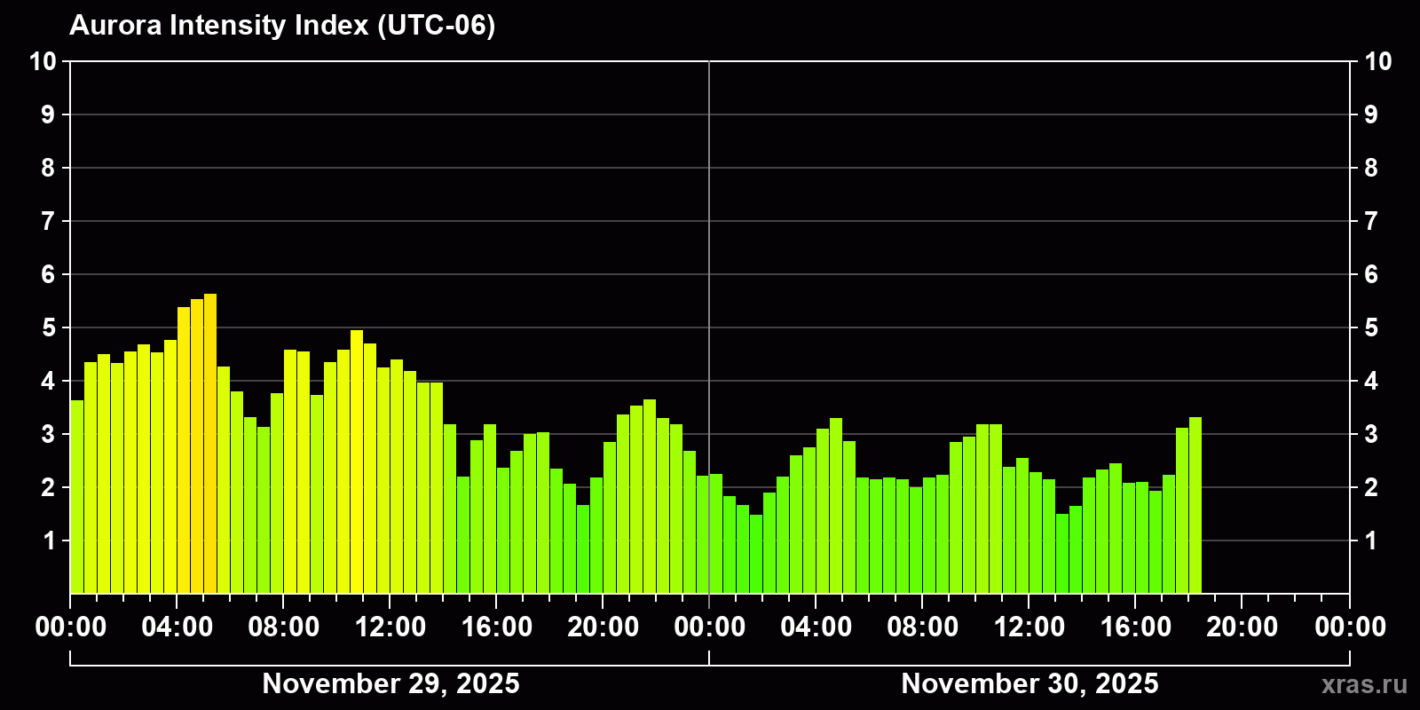 Auroral intensity index and the theoretically possible latitude of observations for nighttime in the Western Hemisphere as of 2025-11-30 17:59 (end of day) local time