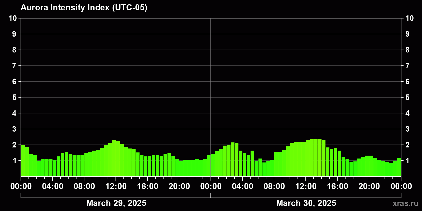Changes in the auroral intensity index from 2025-03-29 to 2025-03-30 local time