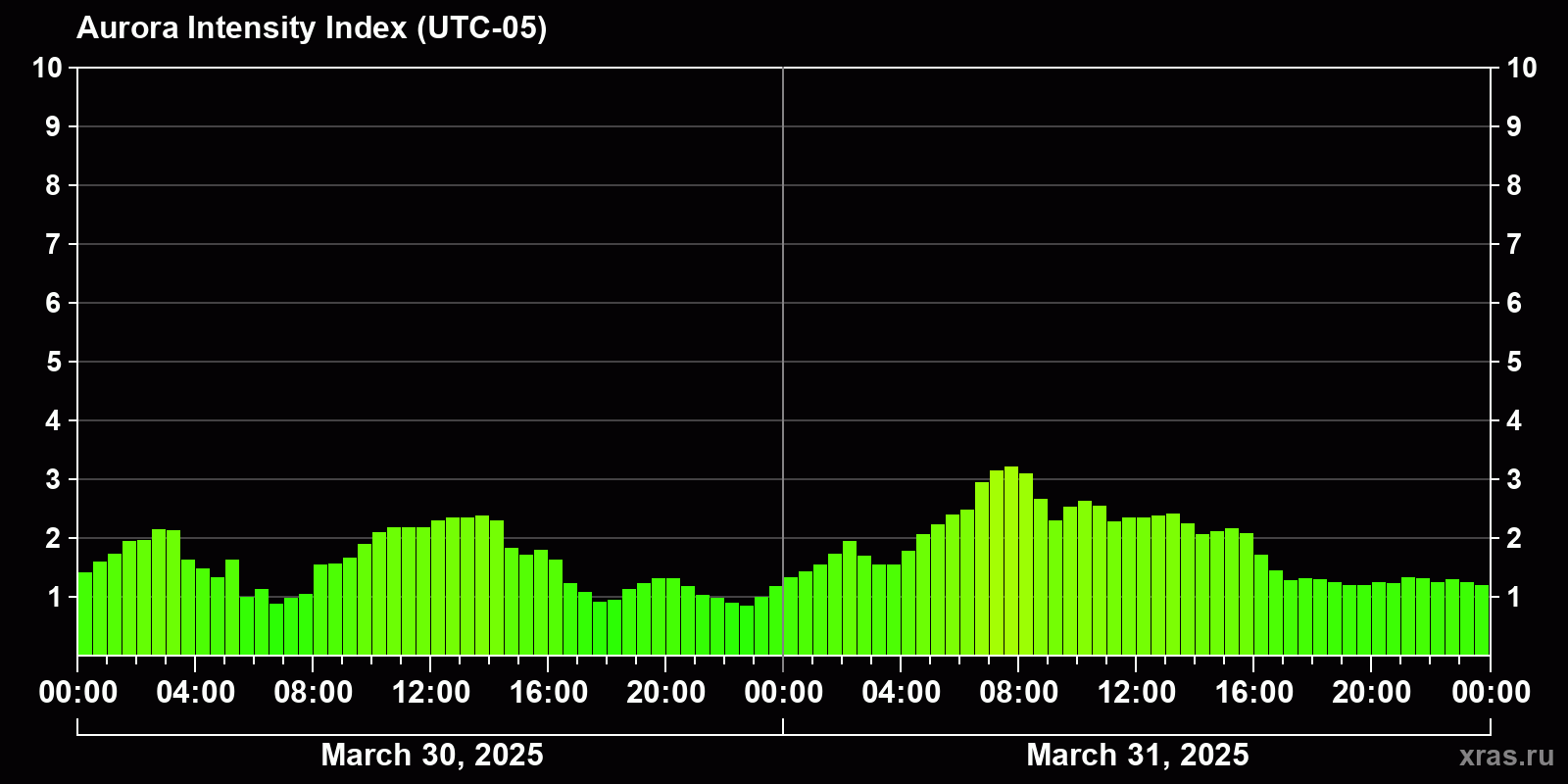 Auroral intensity index and the theoretically possible latitude of observations for nighttime in the Western Hemisphere as of 2025-03-31 23:53 (end of day) local time