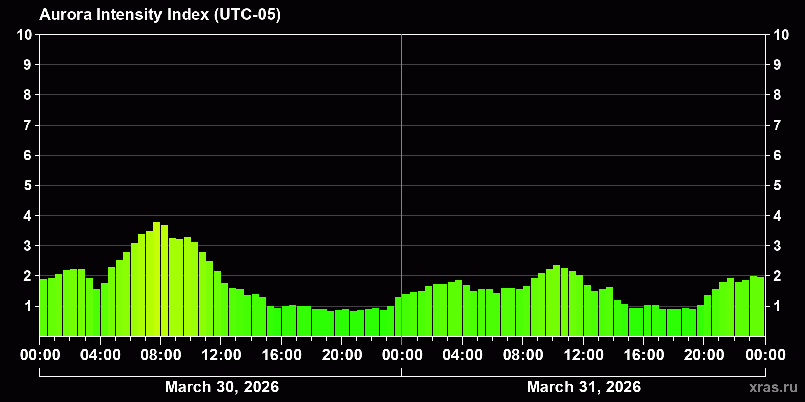 Auroral intensity index and the theoretically possible latitude of observations for nighttime in the Western Hemisphere as of 2026-03-31 23:48 (end of day) local time
