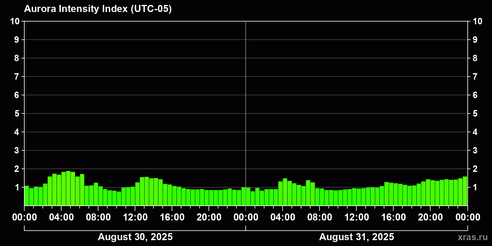 Auroral intensity index and the theoretically possible latitude of observations for nighttime in the Western Hemisphere as of 2025-08-31 23:48 (end of day) local time