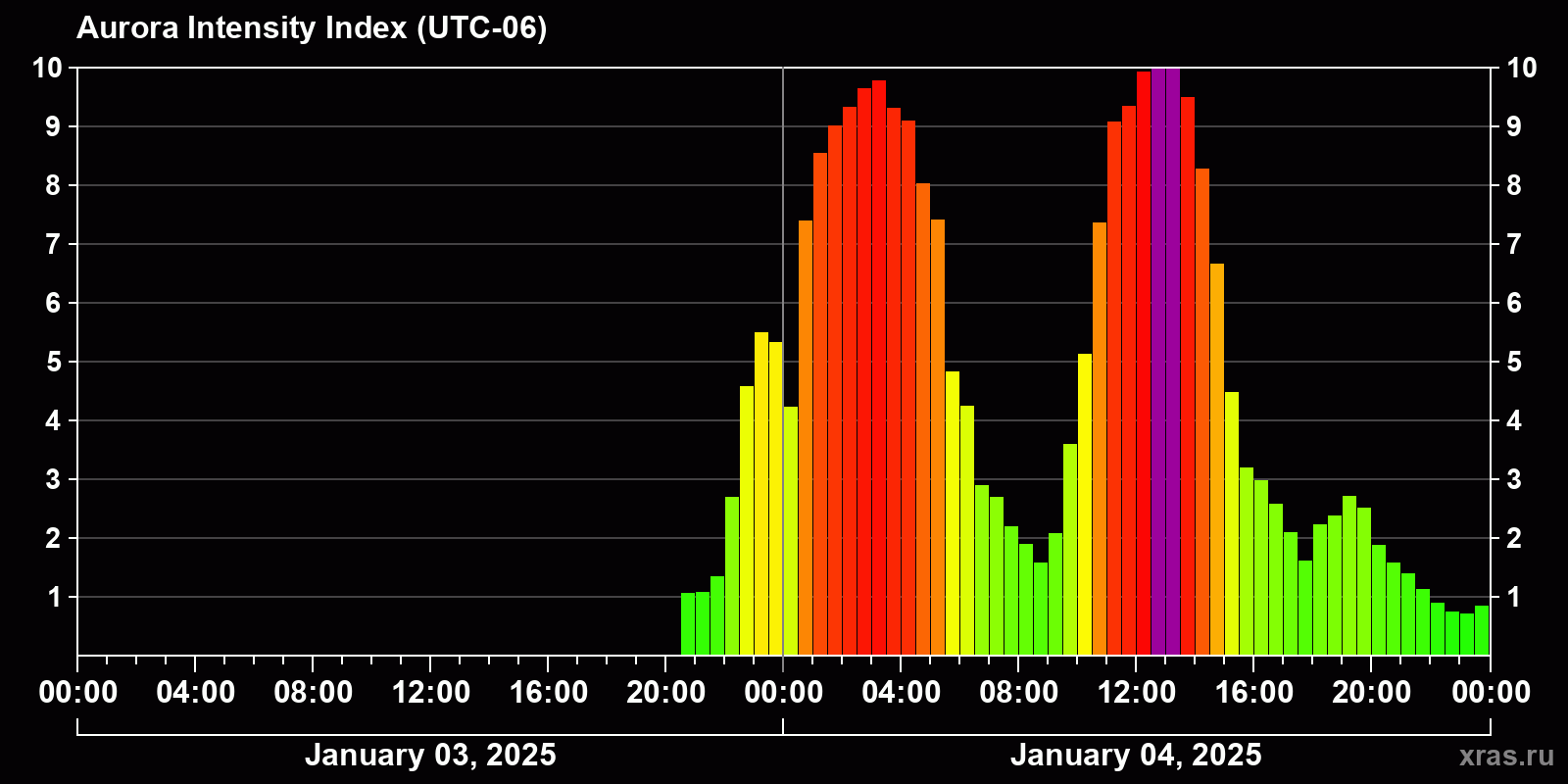 Auroral intensity index and the theoretically possible latitude of observations for nighttime in the Western Hemisphere as of 2025-01-04 23:48 (end of day) local time