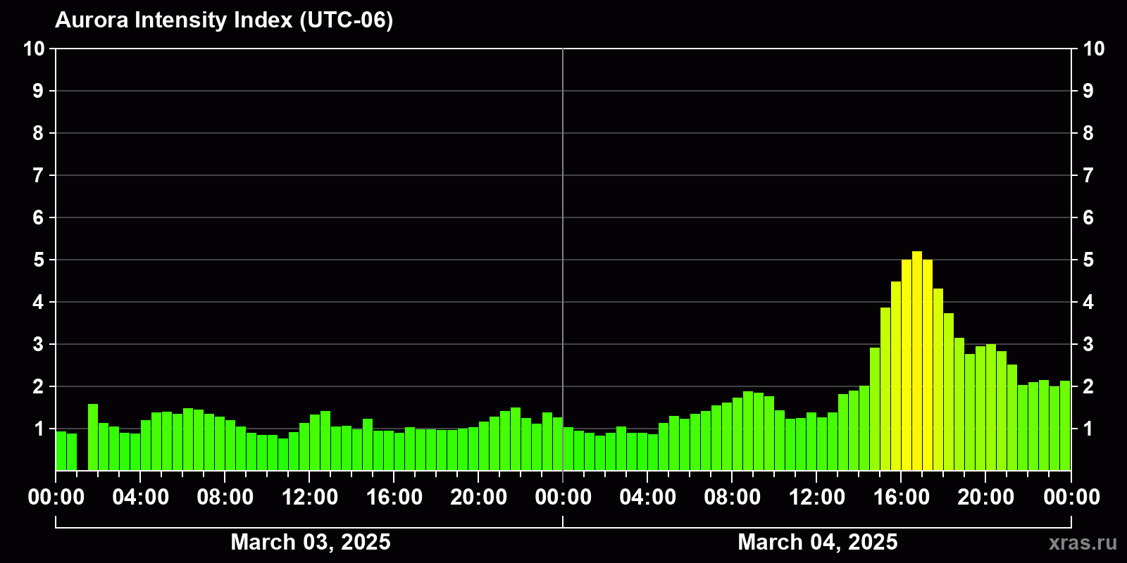 Changes in the auroral intensity index from 2025-03-03 to 2025-03-04 local time