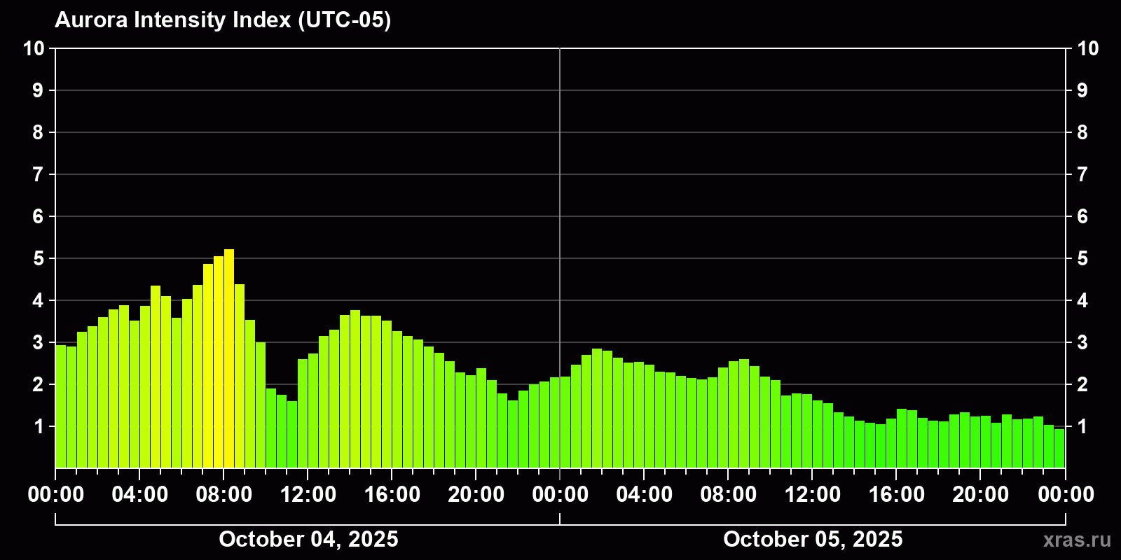 Changes in the auroral intensity index from 2025-10-04 to 2025-10-05 local time