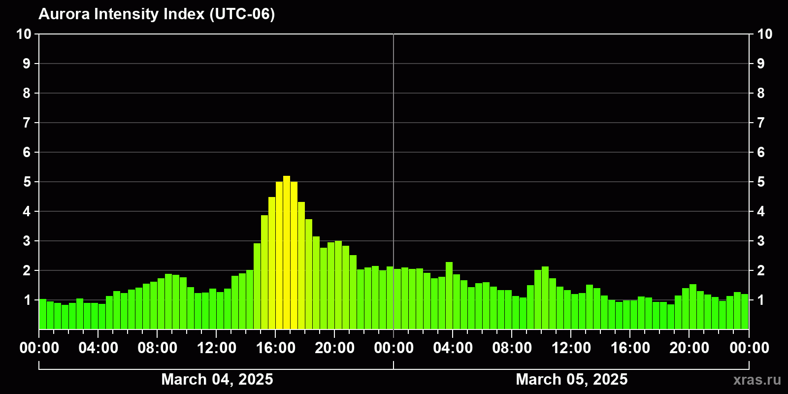 Changes in the auroral intensity index from 2025-03-04 to 2025-03-05 local time