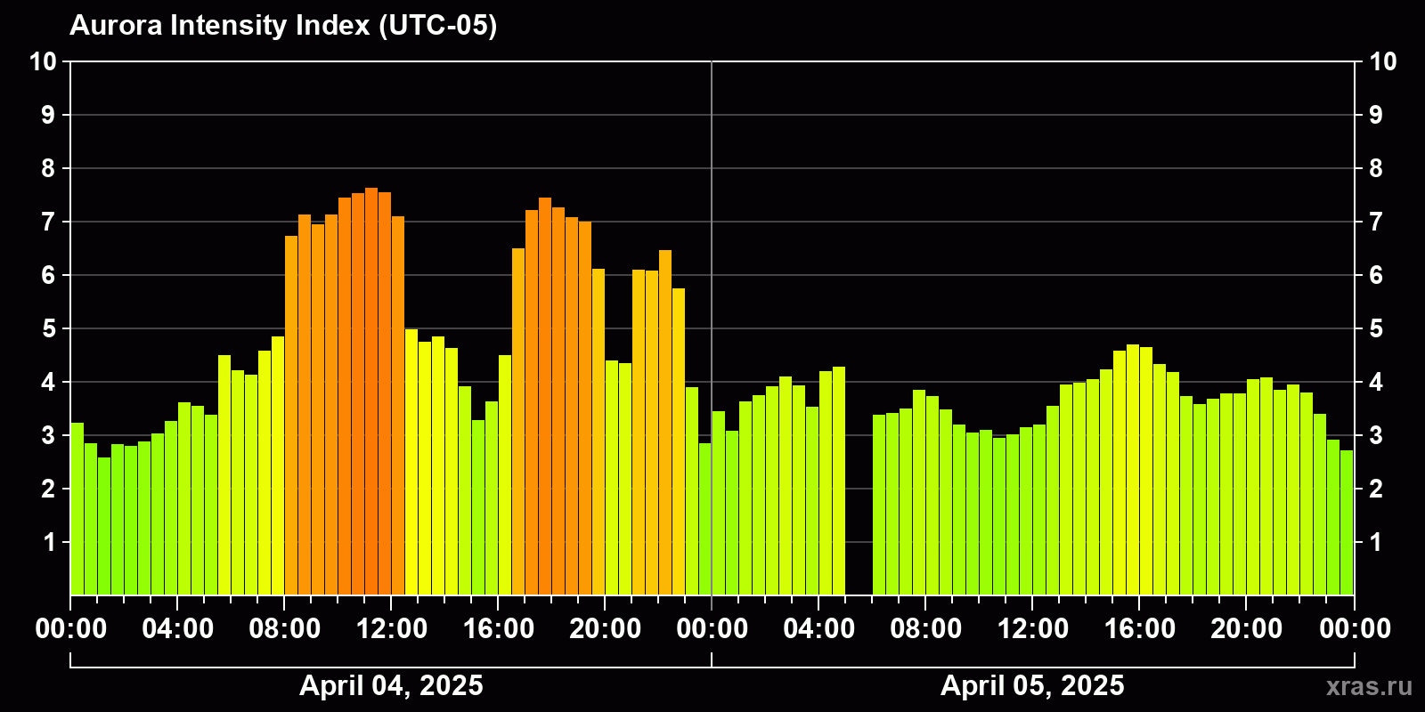 Auroral intensity index and the theoretically possible latitude of observations for nighttime in the Western Hemisphere as of 2025-04-05 23:45 (end of day) local time