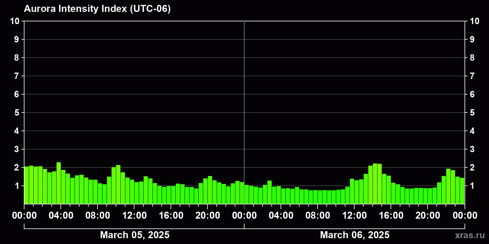Auroral intensity index and the theoretically possible latitude of observations for nighttime in the Western Hemisphere as of 2025-03-06 23:45 (end of day) local time