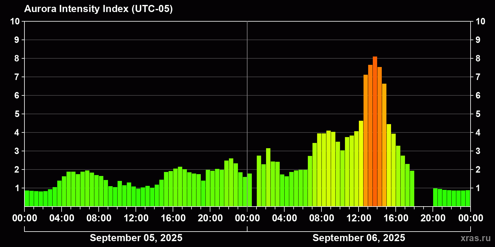 Changes in the auroral intensity index from 2025-09-05 to 2025-09-06 local time
