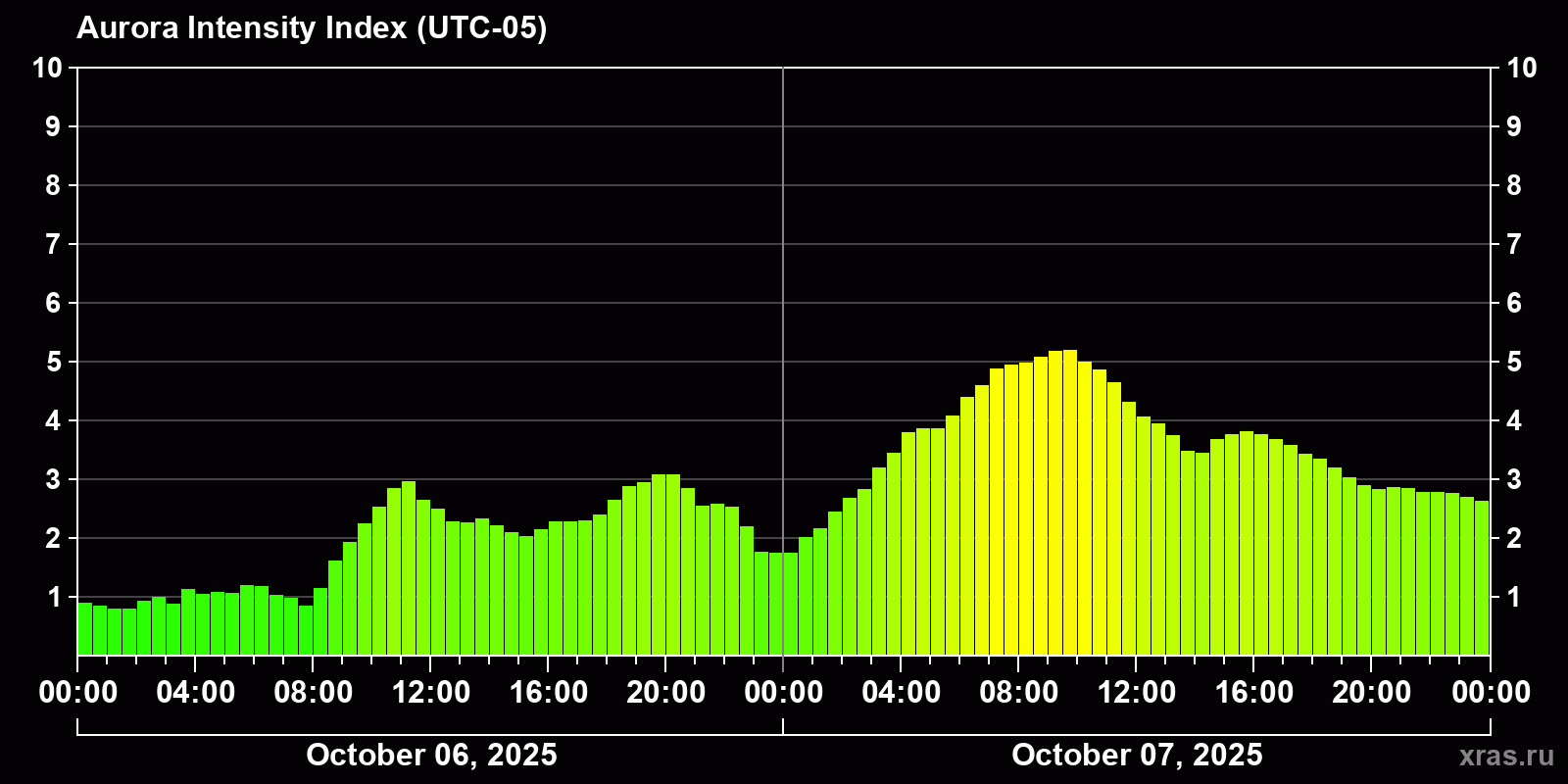 Auroral intensity index and the theoretically possible latitude of observations for nighttime in the Western Hemisphere as of 2025-10-07 23:56 (end of day) local time