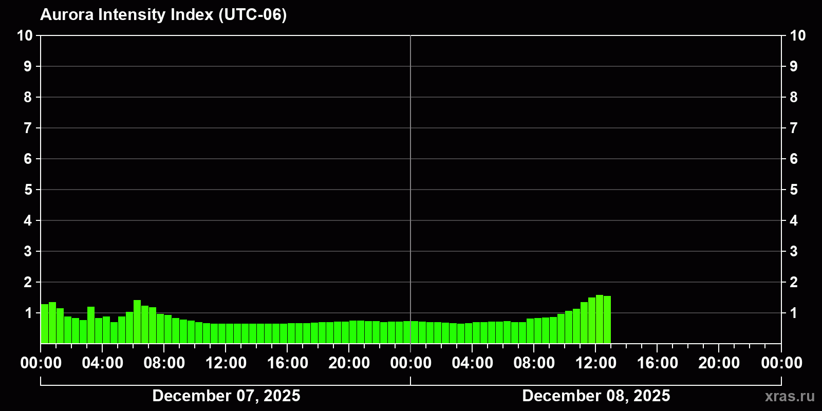 Auroral intensity index and the theoretically possible latitude of observations for nighttime in the Western Hemisphere as of 2025-12-08 11:36 (end of day) local time