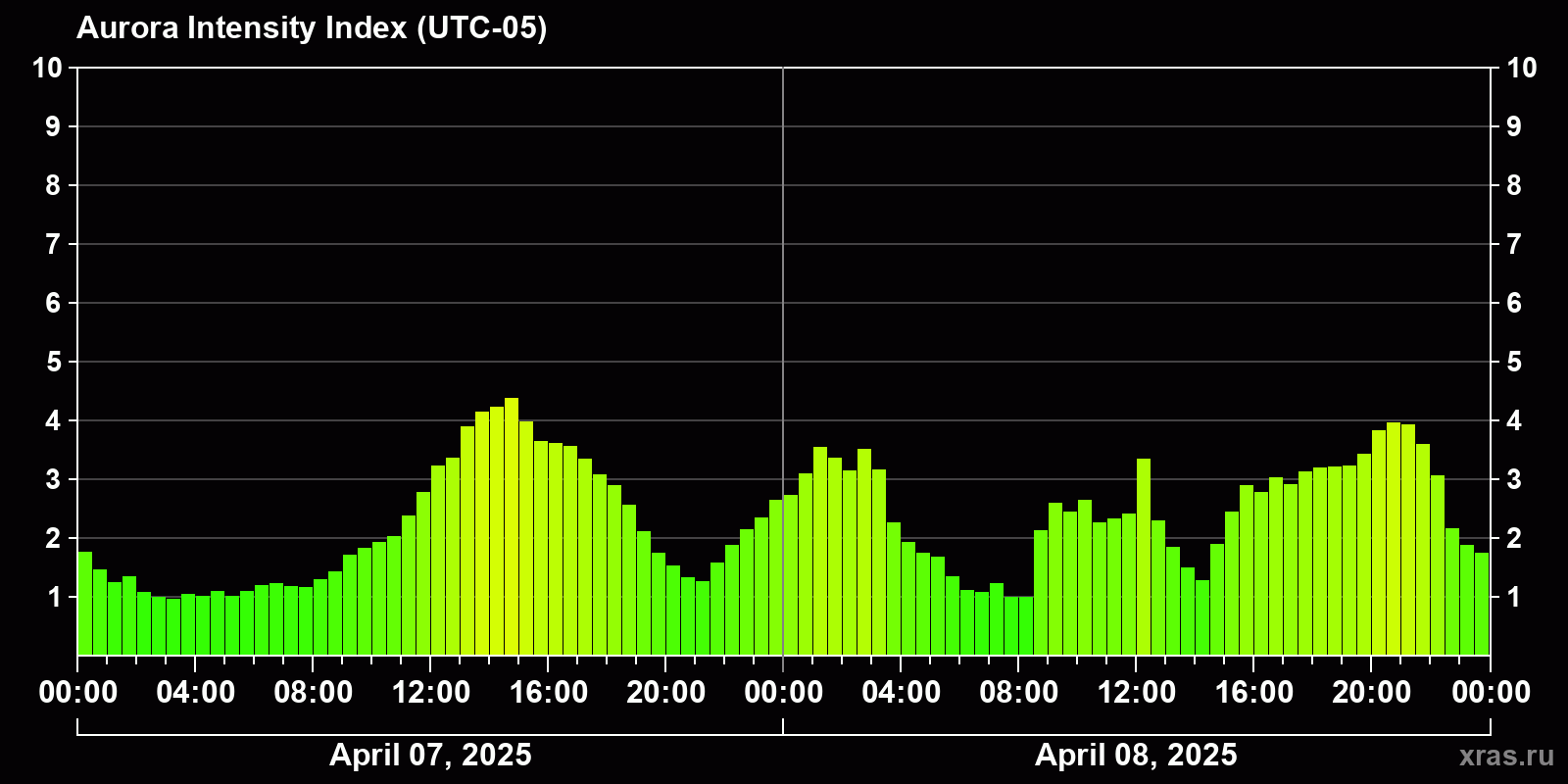 Auroral intensity index and the theoretically possible latitude of observations for nighttime in the Western Hemisphere as of 2025-04-08 23:53 (end of day) local time