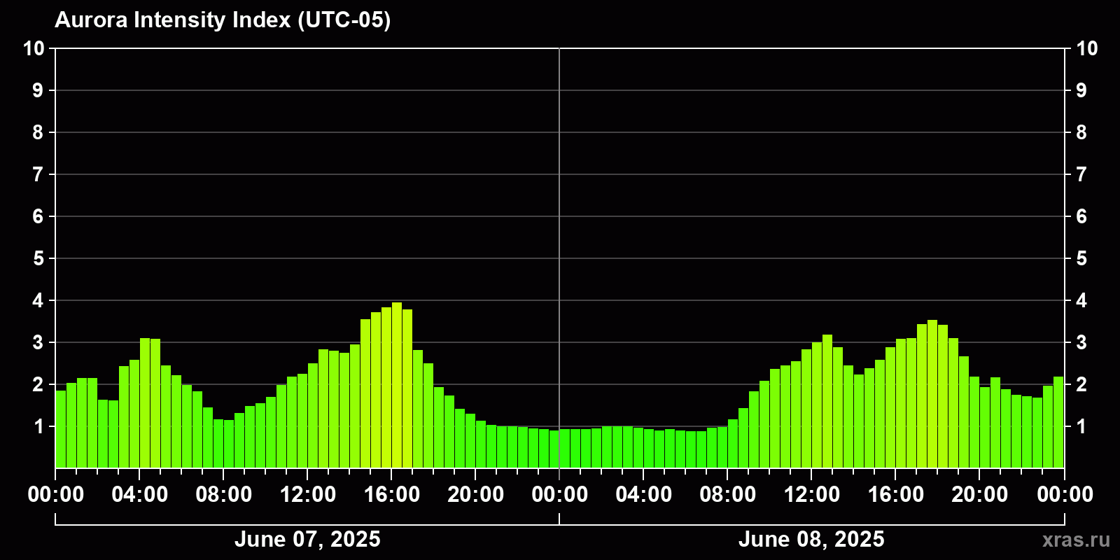 Auroral intensity index and the theoretically possible latitude of observations for nighttime in the Western Hemisphere as of 2025-06-08 23:46 (end of day) local time
