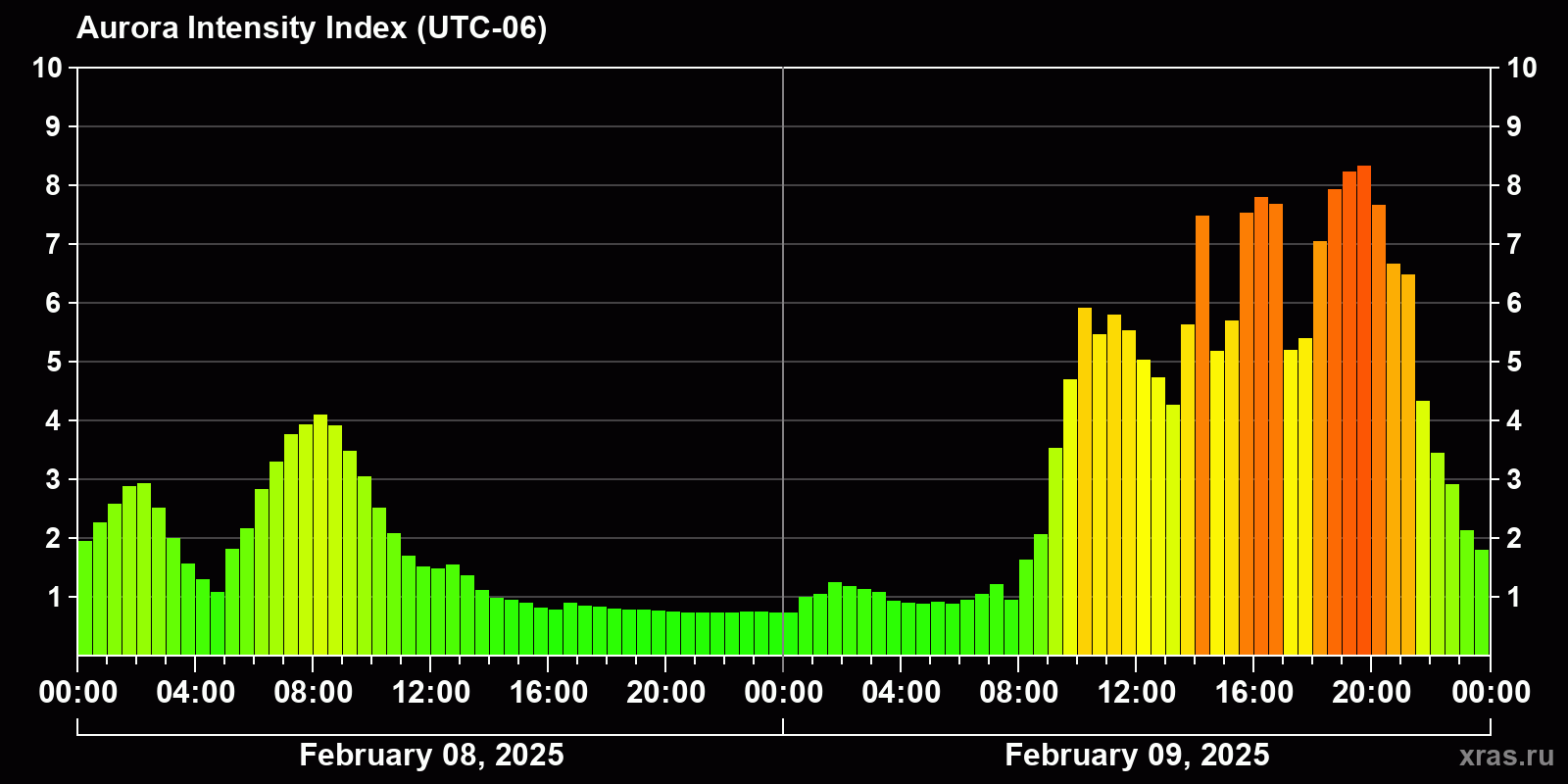 Changes in the auroral intensity index from 2025-02-08 to 2025-02-09 local time