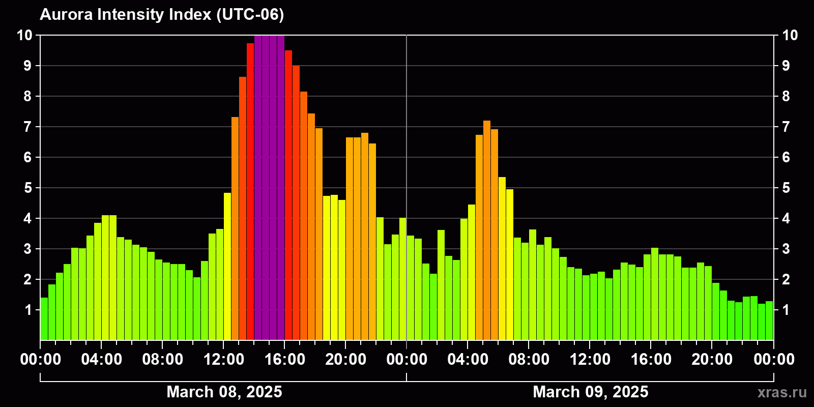 Auroral intensity index and the theoretically possible latitude of observations for nighttime in the Western Hemisphere as of 2025-03-09 23:48 (end of day) local time