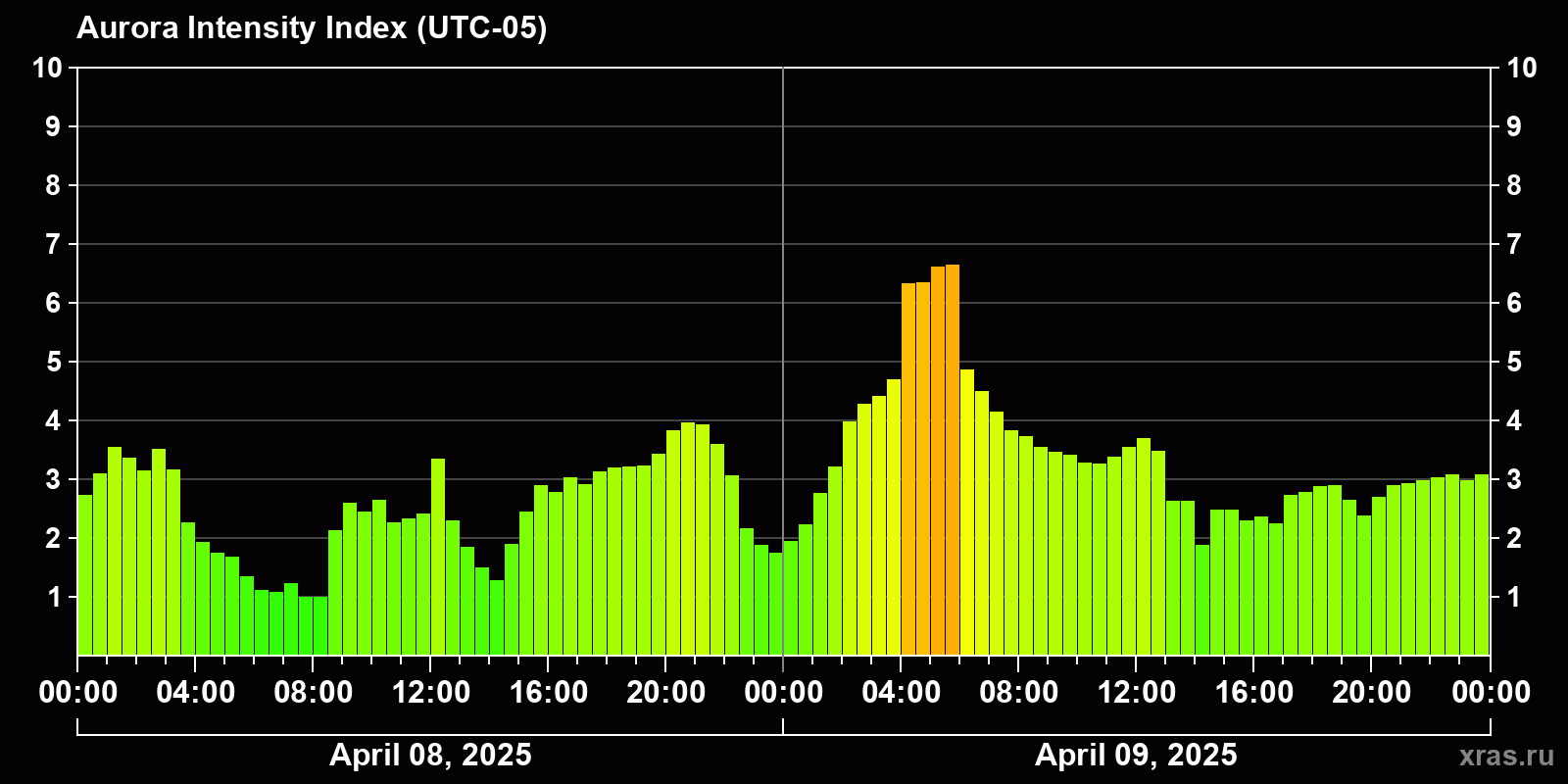 Auroral intensity index and the theoretically possible latitude of observations for nighttime in the Western Hemisphere as of 2025-04-09 23:46 (end of day) local time