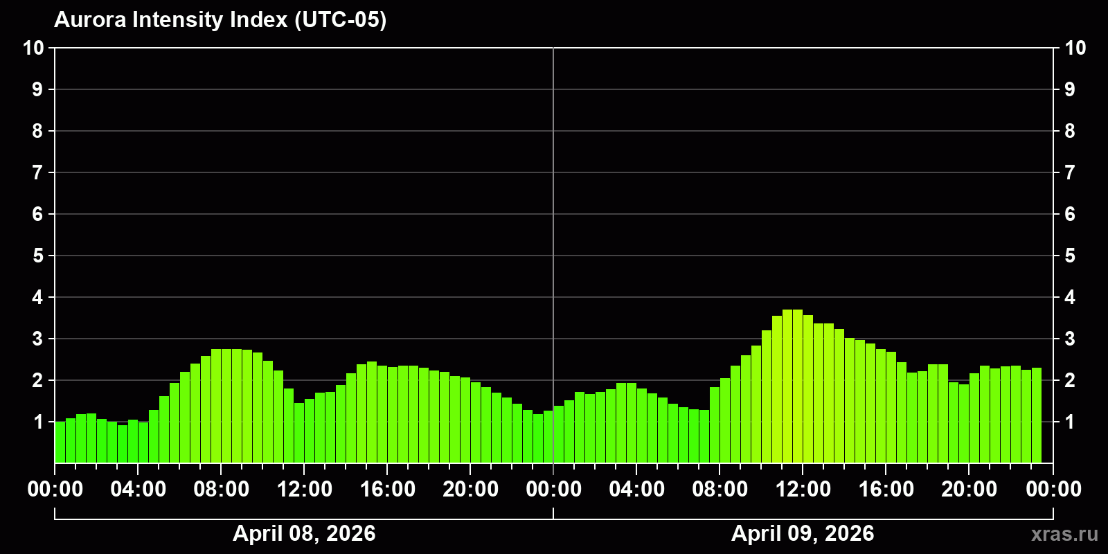 Auroral intensity index and the theoretically possible latitude of observations for nighttime in the Western Hemisphere as of 2026-04-09 16:14 (end of day) local time