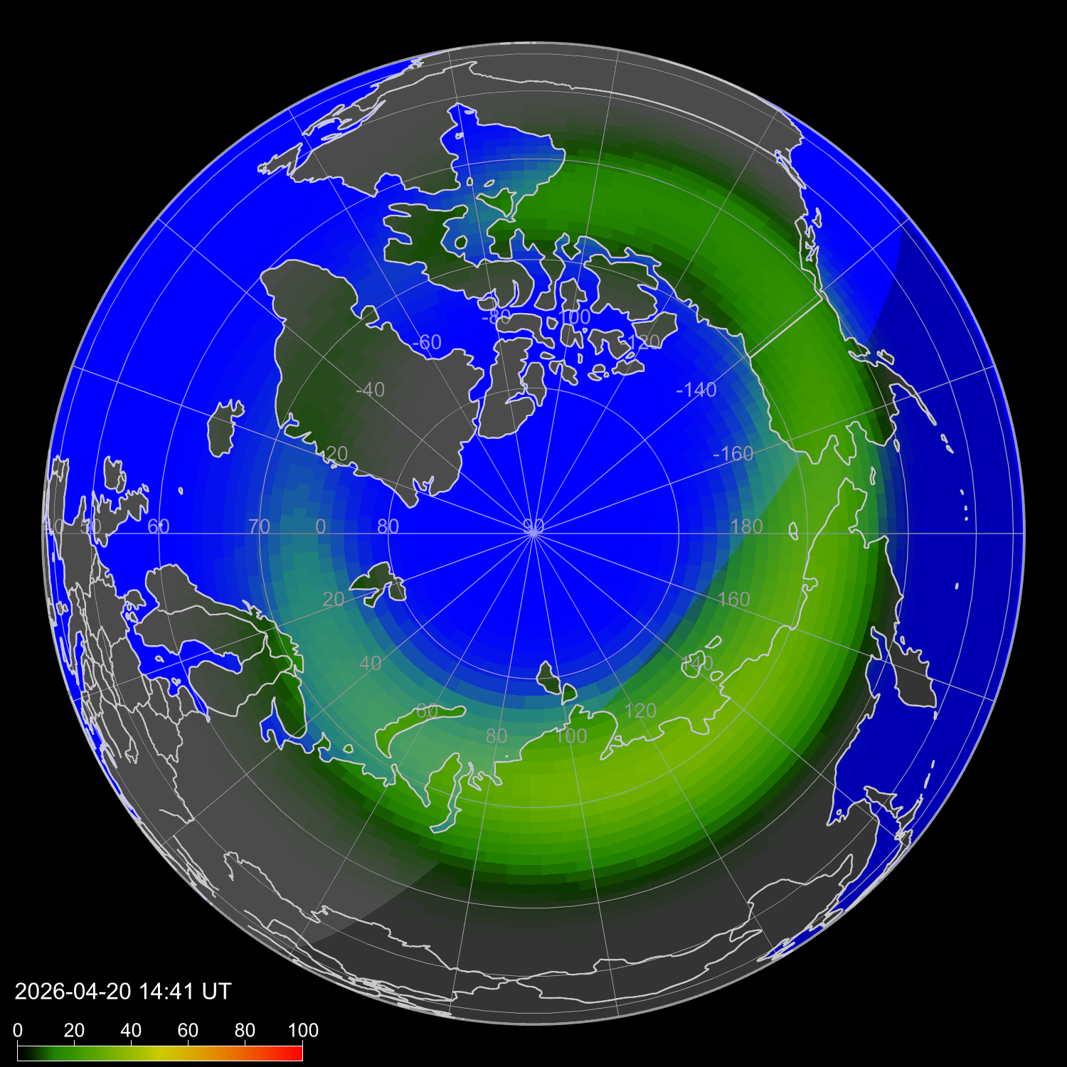 Changes and hourly forecast of the auroral intensity index from 2026-04-19 to 2026-04-20