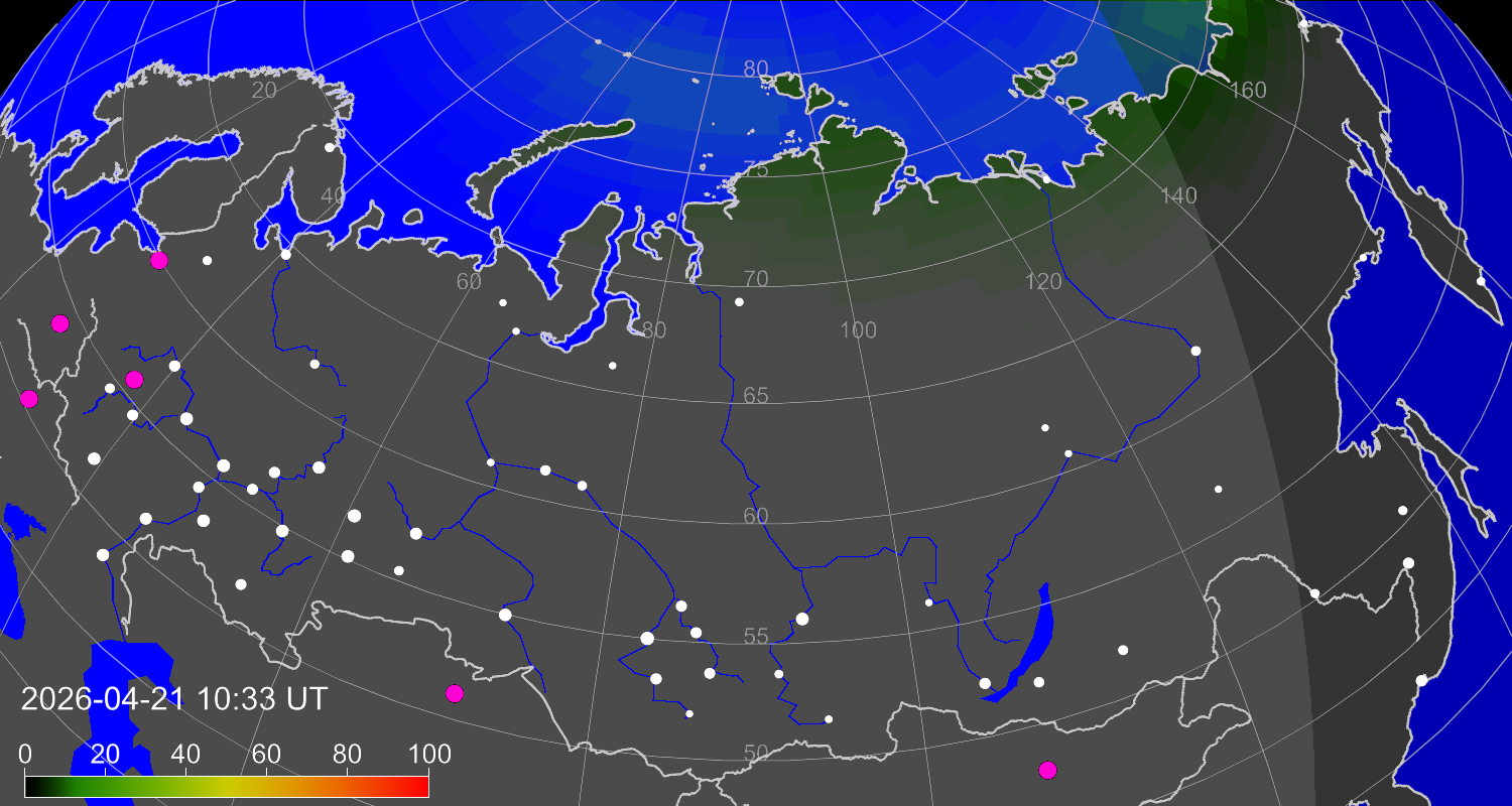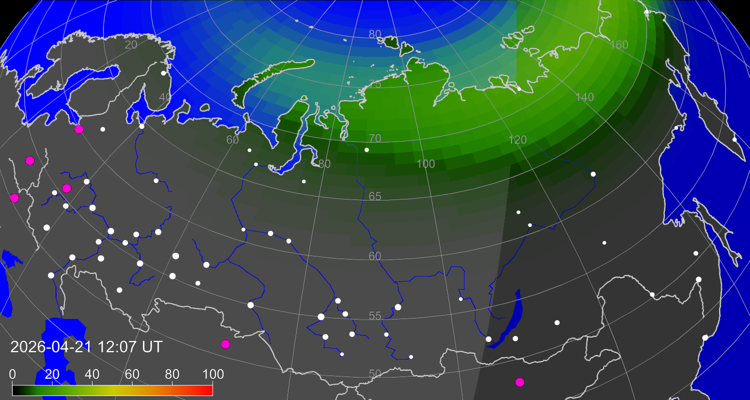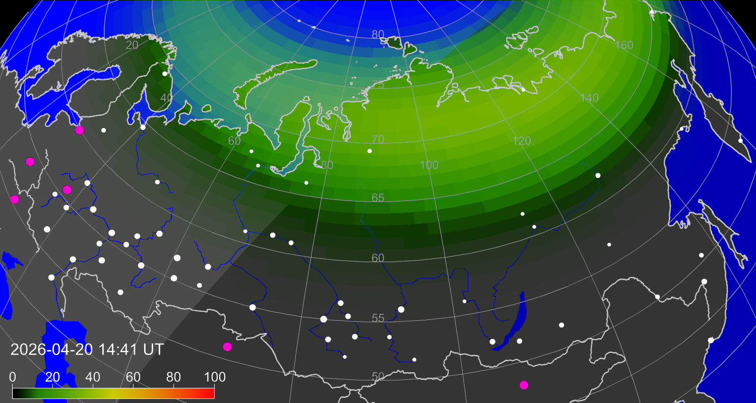 Auroral intensity index and theoretically possible latitude of observations for nighttime in the Estern Hemisphere