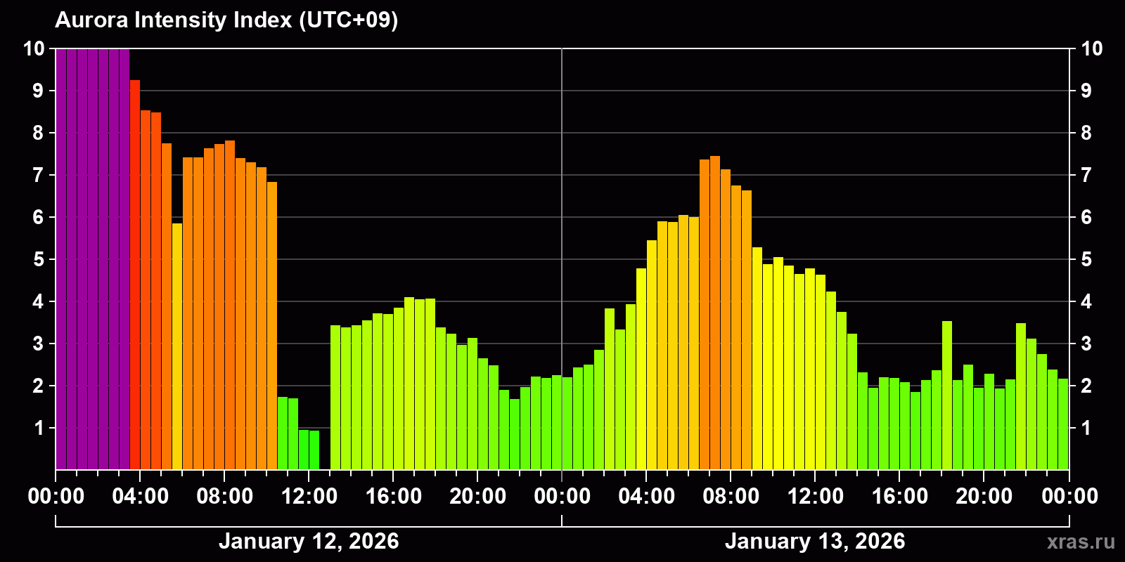 Changes in the auroral intensity index from 2026-01-12 to 2026-01-13 local time