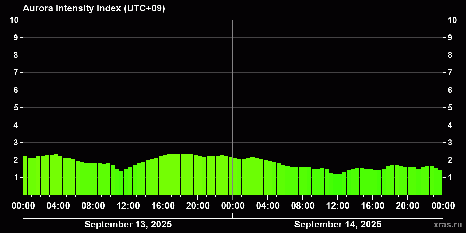 Auroral intensity index and the theoretically possible latitude of observations for nighttime in the Estern Hemisphere as of 2025-09-14 23:50 (end of day) local time