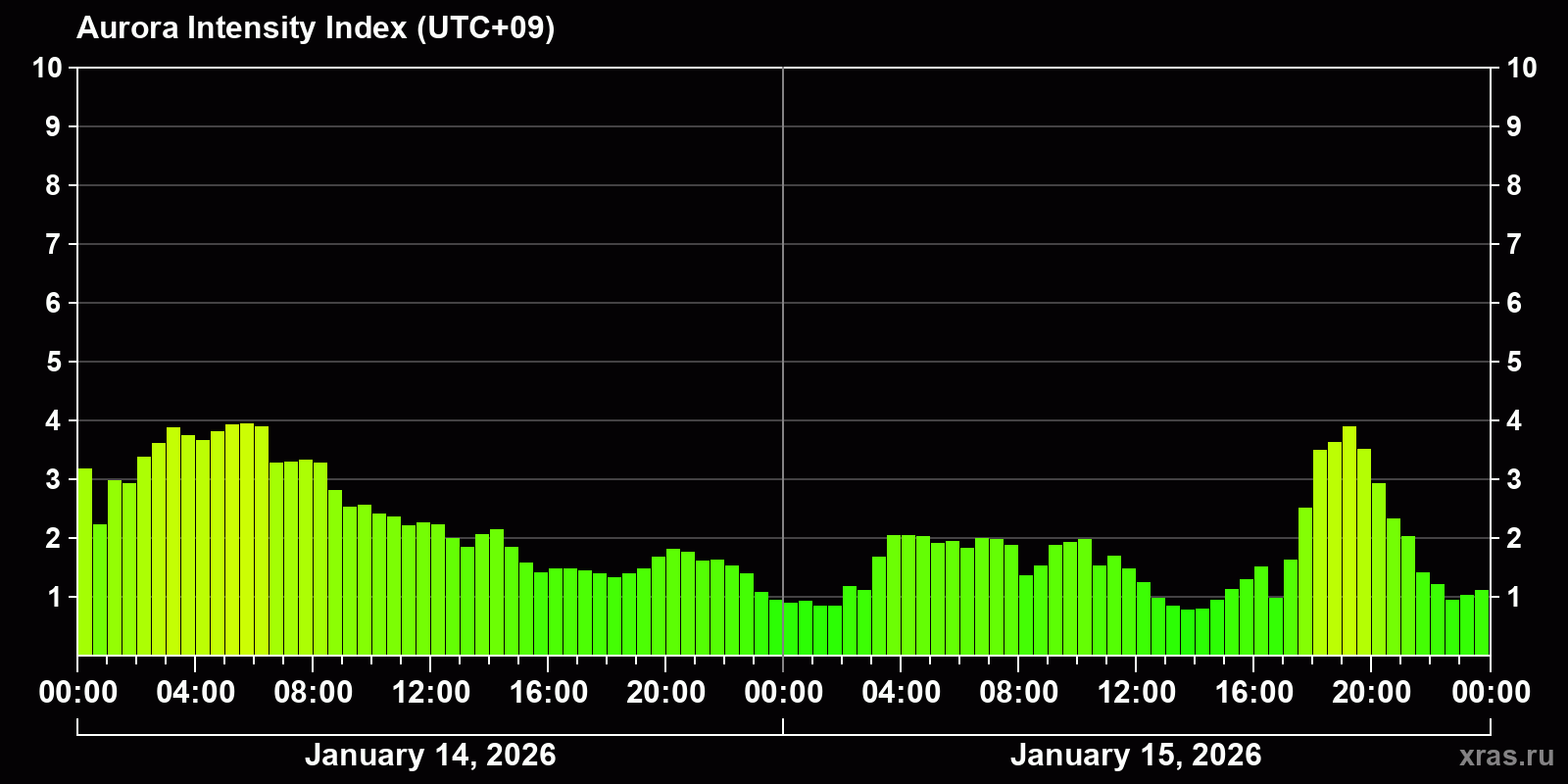 Changes in the auroral intensity index from 2026-01-14 to 2026-01-15 local time